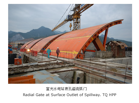 宣光水電站位于越南宣光省吶夯縣(譯音)境內(nèi),距首都河內(nèi)約300公里,電站攔河壩壩頂高程124.5M,裝機總量340MW(3X114MW/臺 ),其全套金屬結(jié)構(gòu)設(shè)備由我公司提供, 工程總量約有7300噸,包括6孔進水口(6m×12m)、8道瀉洪底孔(4.5m×6m)和4道溢流表孔(14.5m×11m),三條直徑為7.5米的引水壓力鋼管道,以及18套液壓啟閉機和3臺門機。