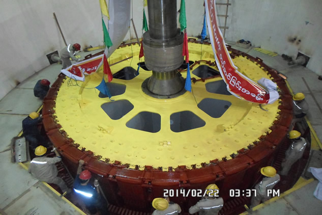 我公司承建的緬甸邦朗二期水電站(上邦朗水電站項目)于2014年2月22日凌晨順利將2#機轉(zhuǎn)子吊裝就位,緬甸電力部各級領(lǐng)導(dǎo)和中方項目部全體人員共同見證了這一刻。在有力的技術(shù)及后勤保障的支持下,業(yè)主單位也對我司該項目的設(shè)計、供貨及機電安裝工作給予了高度肯定。
