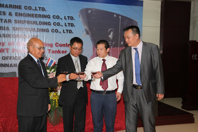 5月15日,在公司世博大廈會議室,隆重舉行了泰國3000噸油輪新造項(xiàng)目簽約儀式,參加項(xiàng)目的各方有泰國Nathalin集團(tuán),泰國PTT集團(tuán),泰國Kasicorn Bank,南京東嘉船廠,南京永華船廠。此次建造的4條3000噸油輪是繼交付7000噸油輪,化學(xué)品船,3000噸油輪之后,我們與泰國客戶的又一次合作,充分表明客戶對我們的信任,及我們在泰國船舶市場的堅(jiān)實(shí)基礎(chǔ)。據(jù)悉,在3000噸油輪之后,我們將繼續(xù)就5000噸成品油輪的合作進(jìn)行深入交流討論。