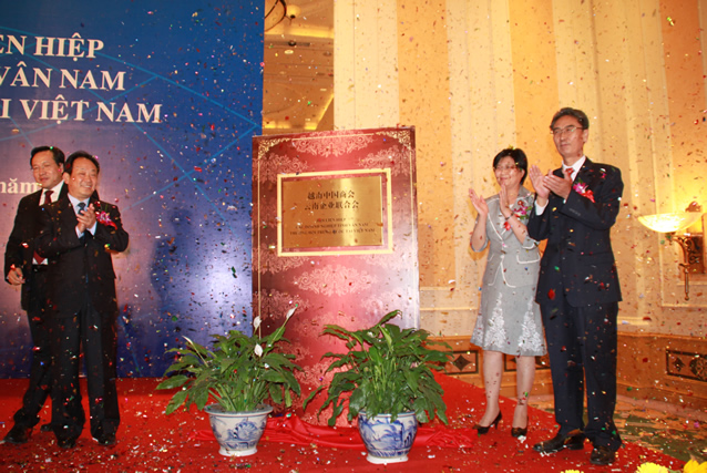 省商務(wù)廳、外辦、越南商會(huì)領(lǐng)導(dǎo)為越南中國商會(huì)云南企業(yè)聯(lián)合會(huì)揭牌