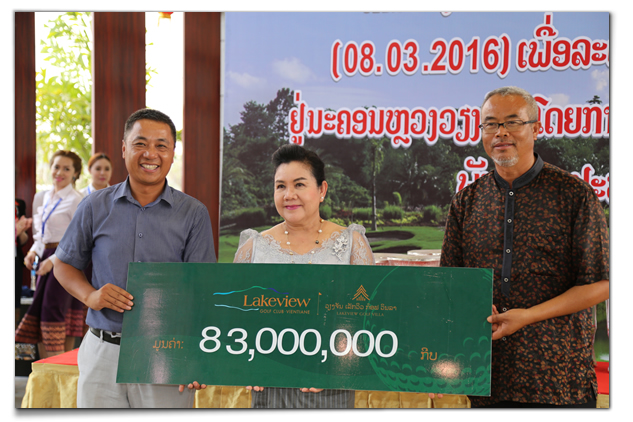 梁衛(wèi)紅副總裁代表Lakeview Golf Club VIENTIANE 向萬象市預(yù)防登革熱捐贈慈善款,老撾國家主席夫人格恩賽哉·賽雅順女士接收捐款。
